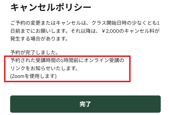電話番号、氏名、メールアドレス、お子様のお名前・年齢・受験級、クレジットカード情報を入力してキャンセルポリシーにチェックを入れて「クラスを予約」をクリック(タップ)してください。(クレジットカード決済となります)